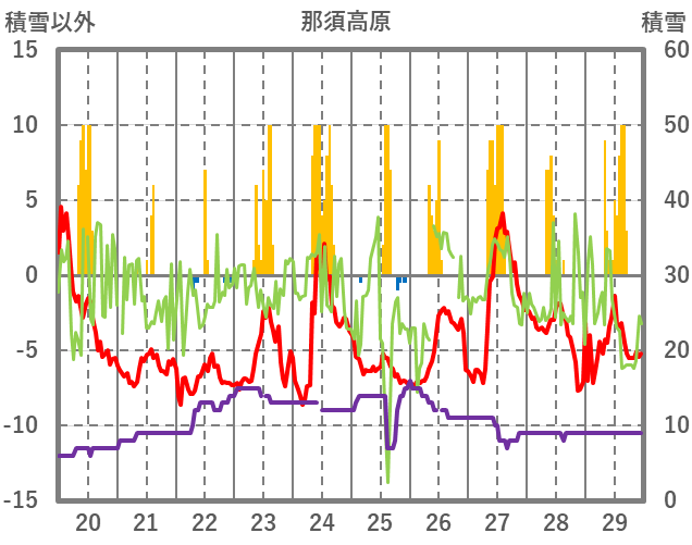 | 日 | 時 | 気温 | 降水 | 風向/風速 | 日照 | 積雪 | 降雪 |
