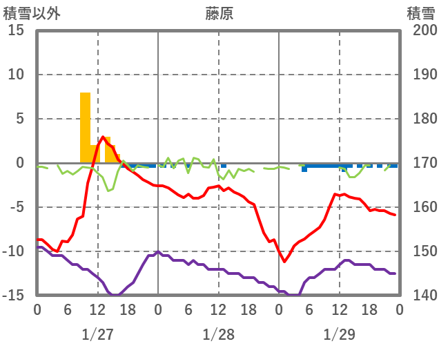 | 日 | 時 | 気温 | 降水 | 風向/風速 | 日照 | 積雪 | 降雪 |