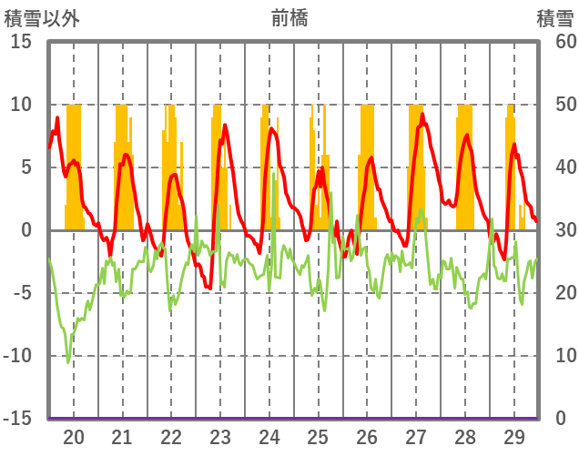 | 日 | 時 | 気温 | 降水 | 風向/風速 | 日照 | 積雪 | 降雪 |