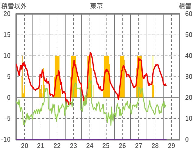 | 日 | 時 | 気温 | 降水 | 風向/風速 | 日照 | 積雪 | 降雪 |