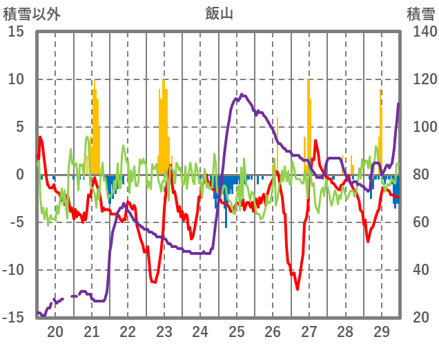 | 日 | 時 | 気温 | 降水 | 風向/風速 | 日照 | 積雪 | 降雪 |