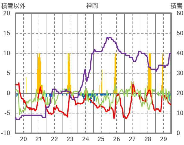 | 日 | 時 | 気温 | 降水 | 風向/風速 | 日照 | 積雪 | 降雪 |