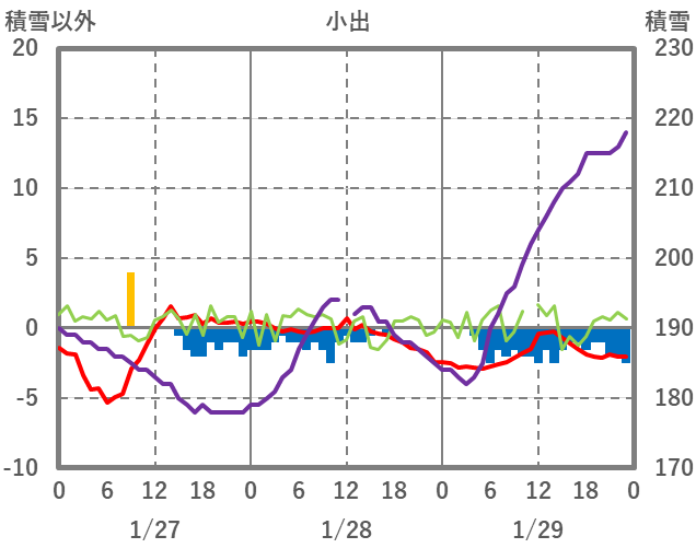 | 日 | 時 | 気温 | 降水 | 風向/風速 | 日照 | 積雪 | 降雪 |