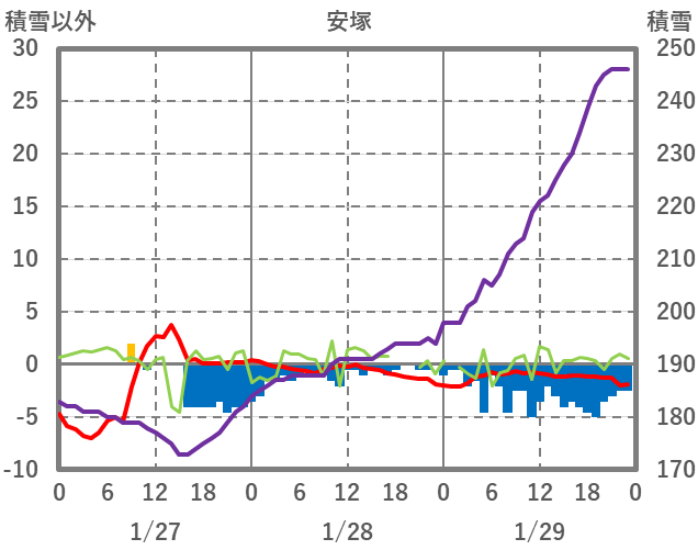 | 日 | 時 | 気温 | 降水 | 風向/風速 | 日照 | 積雪 | 降雪 |