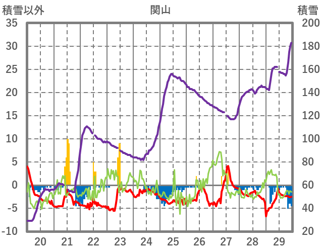| 日 | 時 | 気温 | 降水 | 風向/風速 | 日照 | 積雪 | 降雪 |