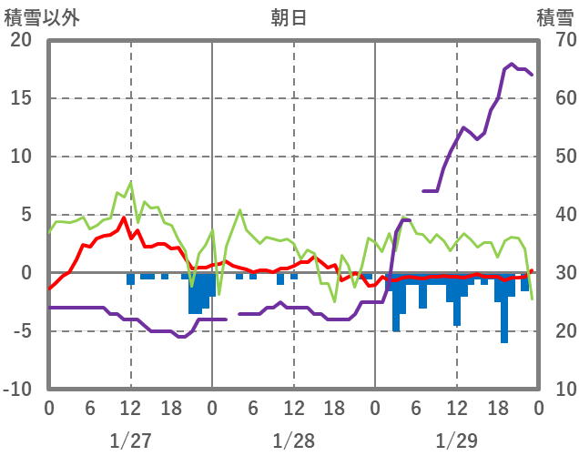 | 日 | 時 | 気温 | 降水 | 風向/風速 | 日照 | 積雪 | 降雪 |