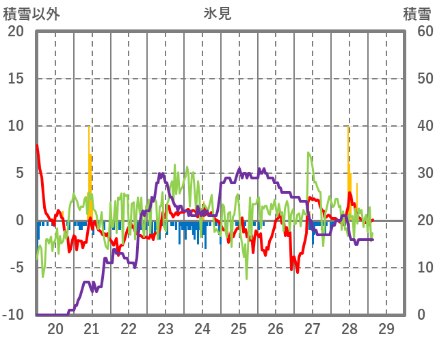 | 日 | 時 | 気温 | 降水 | 風向/風速 | 日照 | 積雪 | 降雪 |