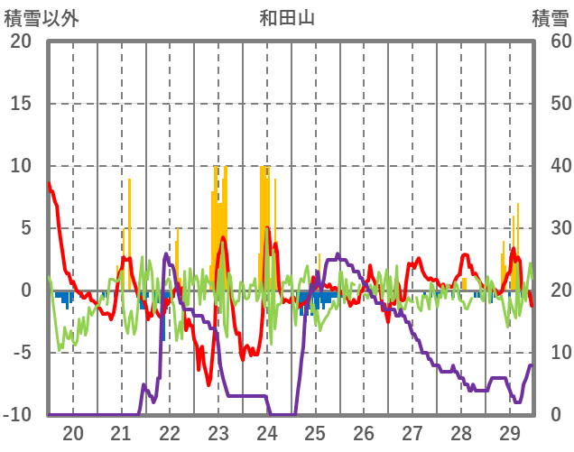 | 日 | 時 | 気温 | 降水 | 風向/風速 | 日照 | 積雪 | 降雪 |