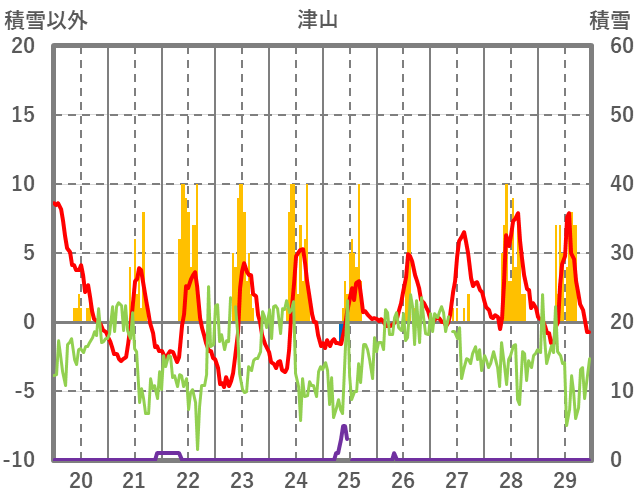 | 日 | 時 | 気温 | 降水 | 風向/風速 | 日照 | 積雪 | 降雪 |