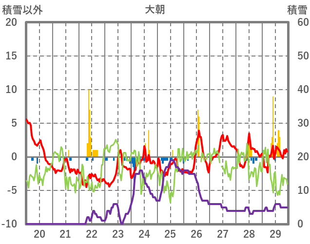 | 日 | 時 | 気温 | 降水 | 風向/風速 | 日照 | 積雪 | 降雪 |