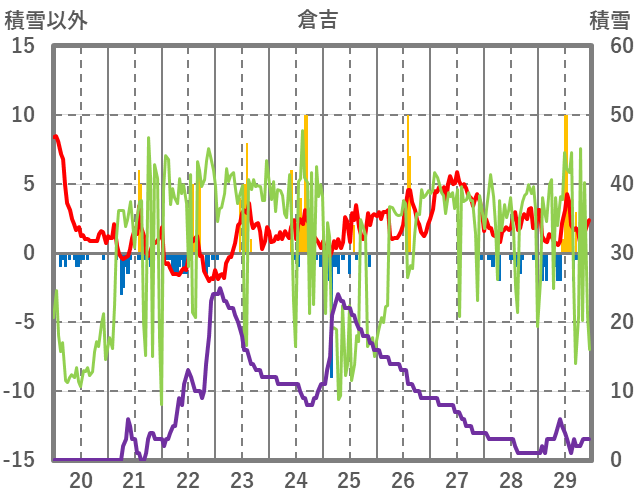 | 日 | 時 | 気温 | 降水 | 風向/風速 | 日照 | 積雪 | 降雪 |