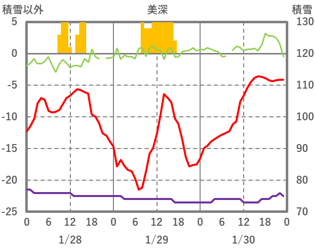 | 日 | 時 | 気温 | 降水 | 風向/風速 | 日照 | 積雪 | 降雪 |