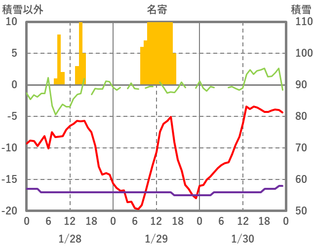 | 日 | 時 | 気温 | 降水 | 風向/風速 | 日照 | 積雪 | 降雪 |