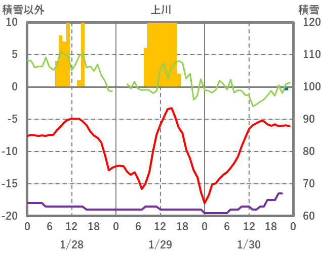 | 日 | 時 | 気温 | 降水 | 風向/風速 | 日照 | 積雪 | 降雪 |