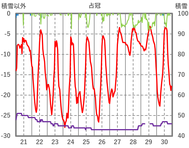 | 日 | 時 | 気温 | 降水 | 風向/風速 | 日照 | 積雪 | 降雪 |