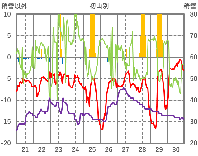 | 日 | 時 | 気温 | 降水 | 風向/風速 | 日照 | 積雪 | 降雪 |