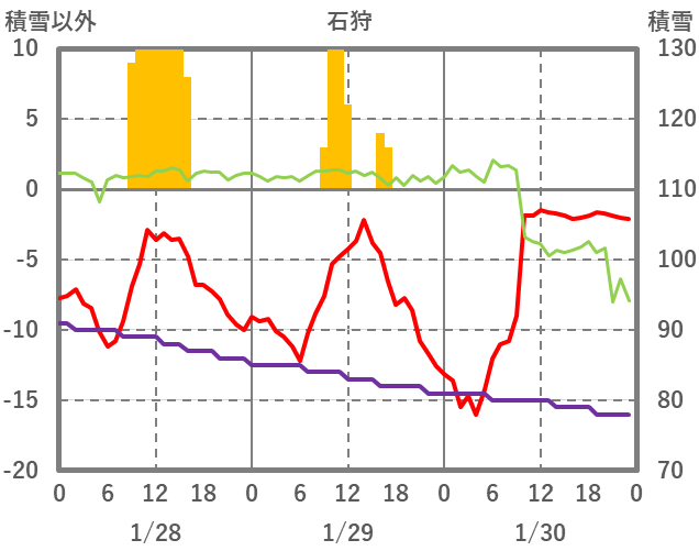 | 日 | 時 | 気温 | 降水 | 風向/風速 | 日照 | 積雪 | 降雪 |