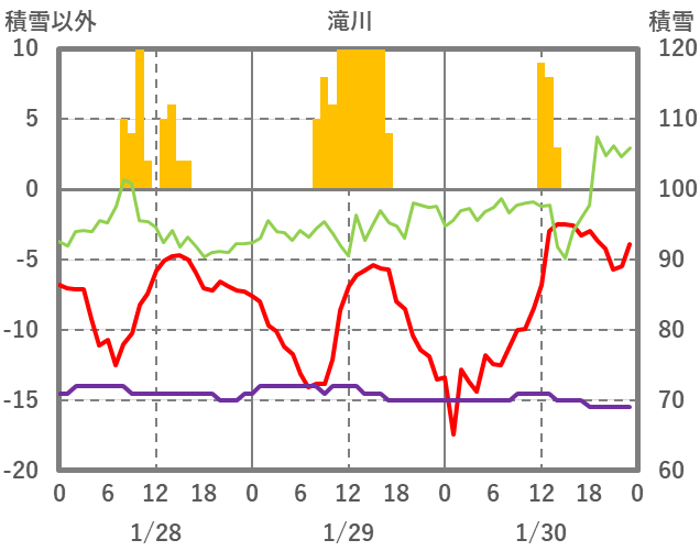 | 日 | 時 | 気温 | 降水 | 風向/風速 | 日照 | 積雪 | 降雪 |