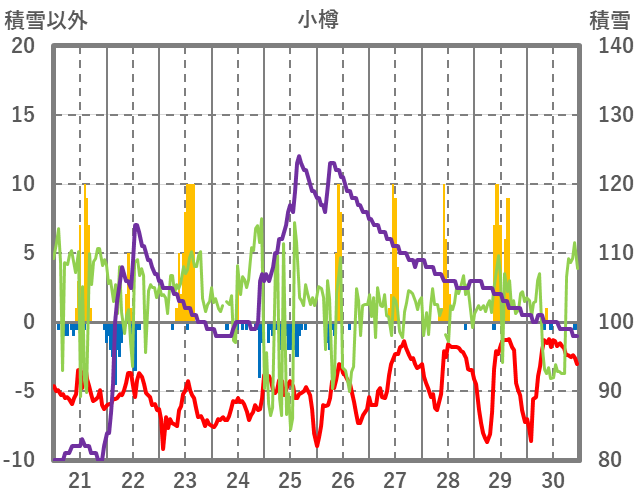 | 日 | 時 | 気温 | 降水 | 風向/風速 | 日照 | 積雪 | 降雪 |