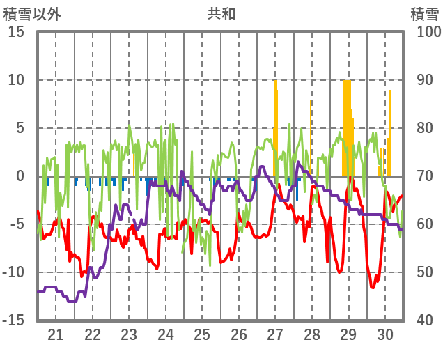 | 日 | 時 | 気温 | 降水 | 風向/風速 | 日照 | 積雪 | 降雪 |