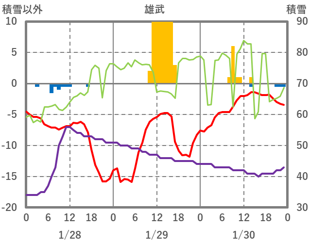 | 日 | 時 | 気温 | 降水 | 風向/風速 | 日照 | 積雪 | 降雪 |