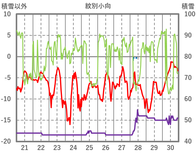 | 日 | 時 | 気温 | 降水 | 風向/風速 | 日照 | 積雪 | 降雪 |