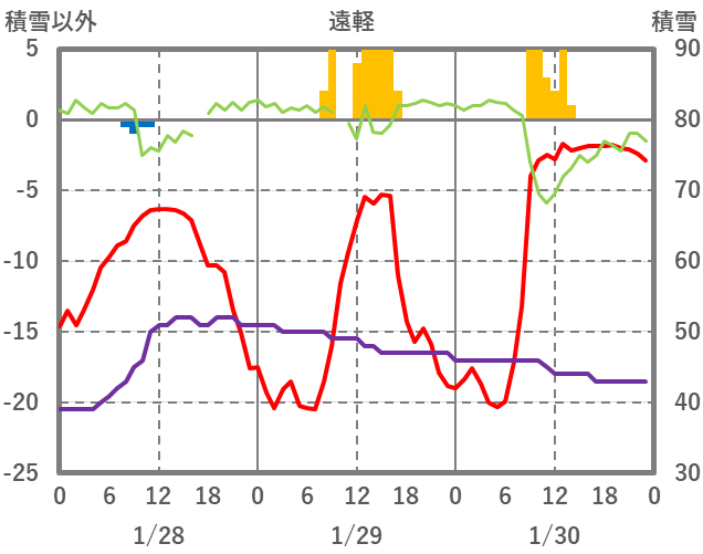 | 日 | 時 | 気温 | 降水 | 風向/風速 | 日照 | 積雪 | 降雪 |