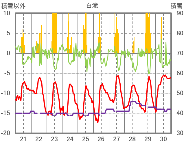 | 日 | 時 | 気温 | 降水 | 風向/風速 | 日照 | 積雪 | 降雪 |