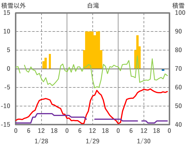 | 日 | 時 | 気温 | 降水 | 風向/風速 | 日照 | 積雪 | 降雪 |