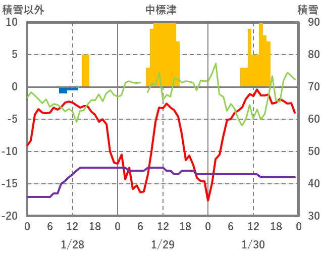| 日 | 時 | 気温 | 降水 | 風向/風速 | 日照 | 積雪 | 降雪 |
