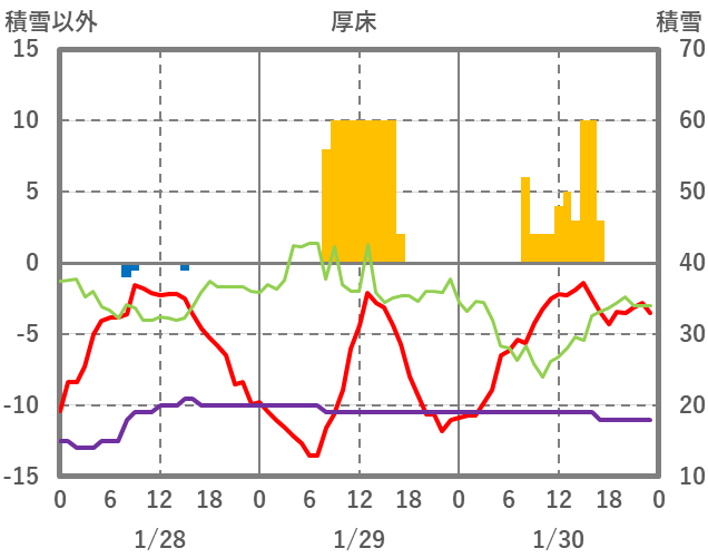 | 日 | 時 | 気温 | 降水 | 風向/風速 | 日照 | 積雪 | 降雪 |