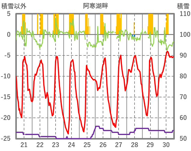| 日 | 時 | 気温 | 降水 | 風向/風速 | 日照 | 積雪 | 降雪 |