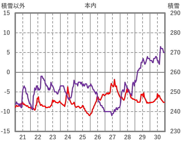 | 日 | 時 | 気温 | 降水 | 風向/風速 | 日照 | 積雪 | 降雪 |