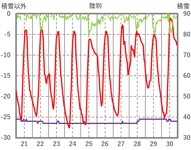| 日 | 時 | 気温 | 降水 | 風向/風速 | 日照 | 積雪 | 降雪 |