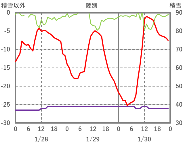| 日 | 時 | 気温 | 降水 | 風向/風速 | 日照 | 積雪 | 降雪 |