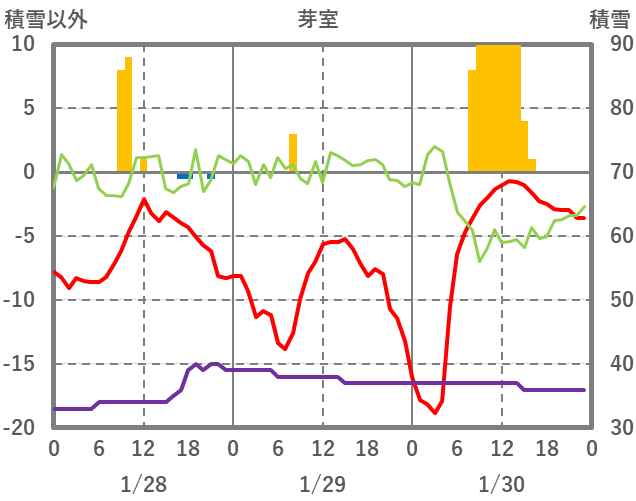 | 日 | 時 | 気温 | 降水 | 風向/風速 | 日照 | 積雪 | 降雪 |
