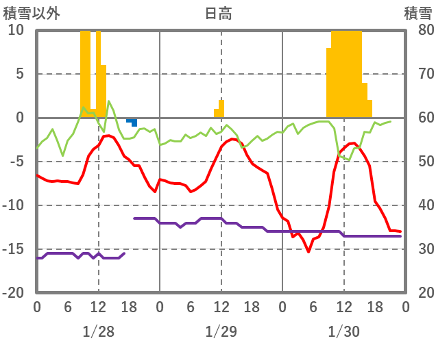 | 日 | 時 | 気温 | 降水 | 風向/風速 | 日照 | 積雪 | 降雪 |