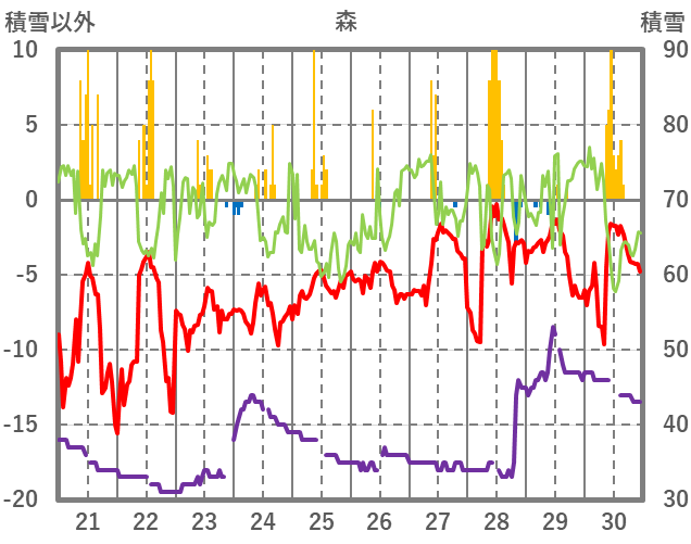 | 日 | 時 | 気温 | 降水 | 風向/風速 | 日照 | 積雪 | 降雪 |