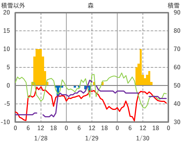 | 日 | 時 | 気温 | 降水 | 風向/風速 | 日照 | 積雪 | 降雪 |