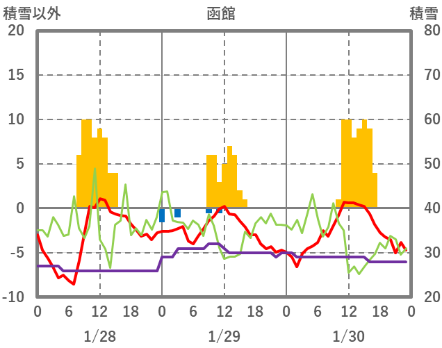 | 日 | 時 | 気温 | 降水 | 風向/風速 | 日照 | 積雪 | 降雪 |