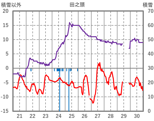 | 日 | 時 | 気温 | 降水 | 風向/風速 | 日照 | 積雪 | 降雪 |