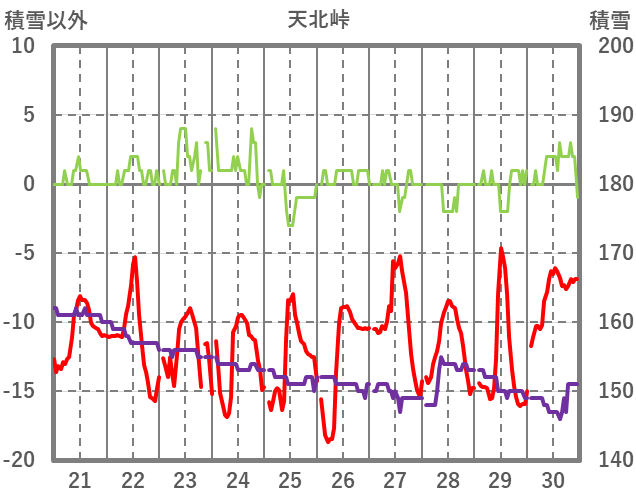 | 日 | 時 | 気温 | 降水 | 風向/風速 | 日照 | 積雪 | 降雪 |