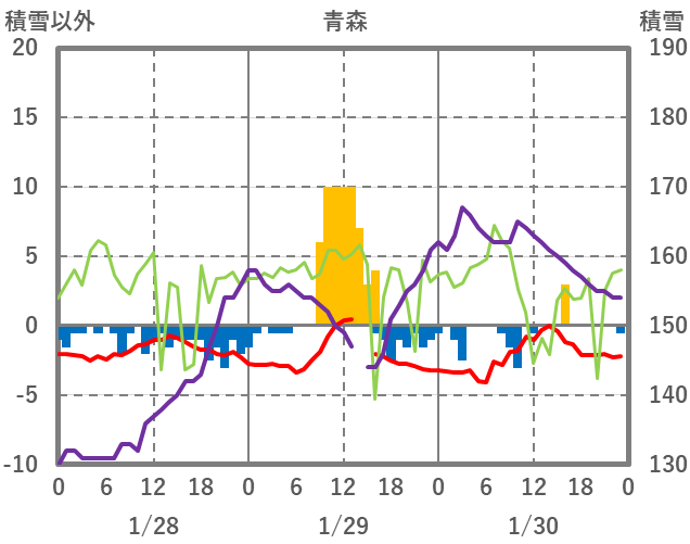 | 日 | 時 | 気温 | 降水 | 風向/風速 | 日照 | 積雪 | 降雪 |