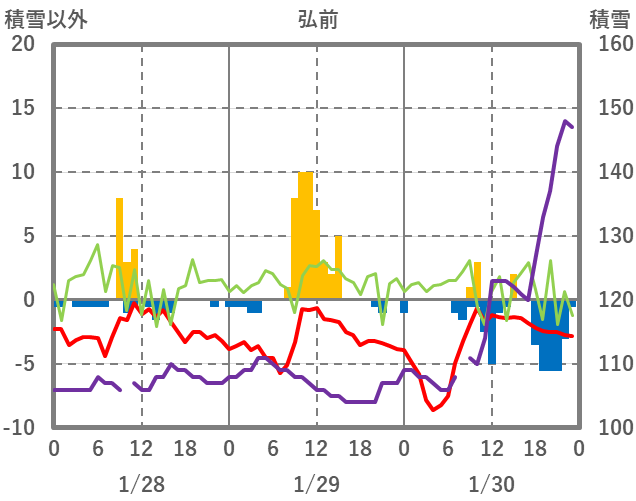 | 日 | 時 | 気温 | 降水 | 風向/風速 | 日照 | 積雪 | 降雪 |