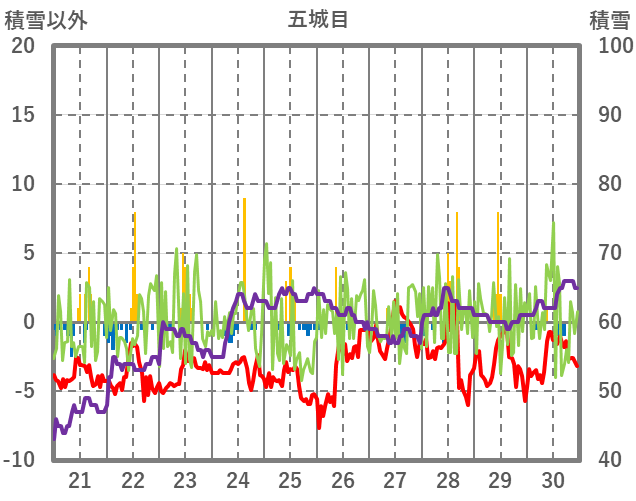 | 日 | 時 | 気温 | 降水 | 風向/風速 | 日照 | 積雪 | 降雪 |