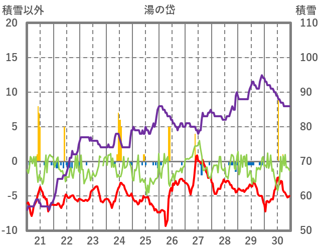 | 日 | 時 | 気温 | 降水 | 風向/風速 | 日照 | 積雪 | 降雪 |