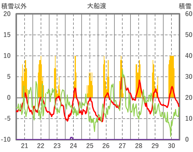 | 日 | 時 | 気温 | 降水 | 風向/風速 | 日照 | 積雪 | 降雪 |