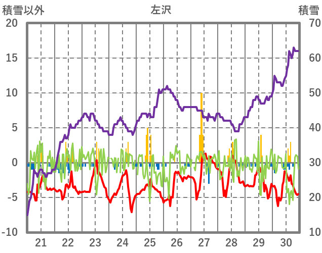 | 日 | 時 | 気温 | 降水 | 風向/風速 | 日照 | 積雪 | 降雪 |