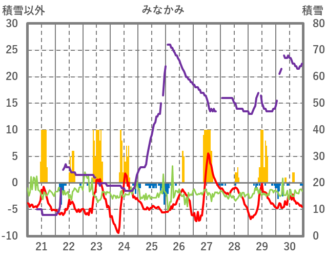 | 日 | 時 | 気温 | 降水 | 風向/風速 | 日照 | 積雪 | 降雪 |