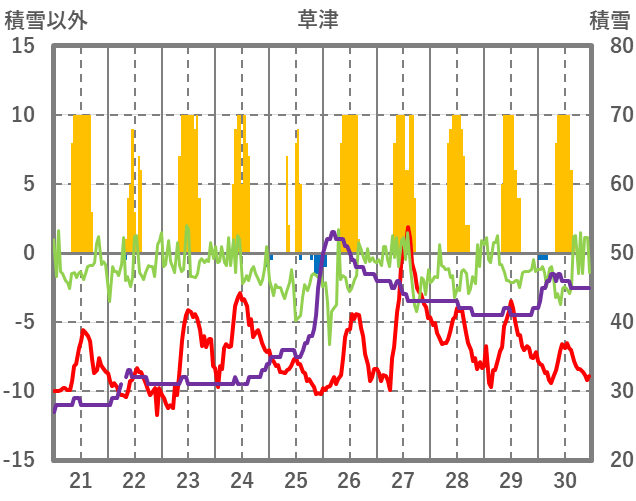 | 日 | 時 | 気温 | 降水 | 風向/風速 | 日照 | 積雪 | 降雪 |